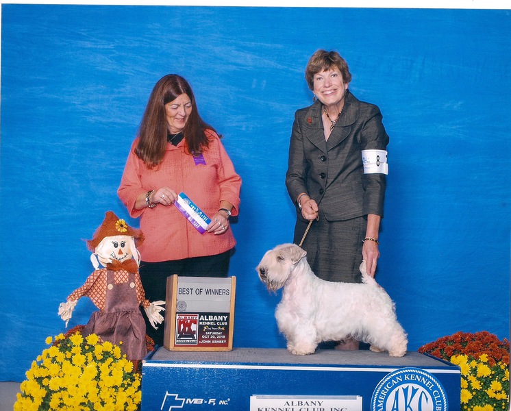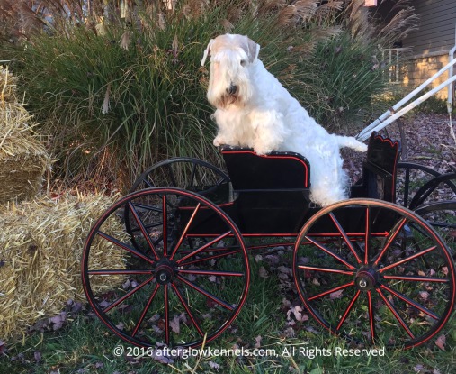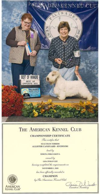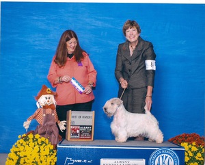 Allister is a very sweet and lovable dog, alert and strong and quick with a kiss. He loves to play with the younger pups and adolescents as though he was still a youngster himself. He has produced wonderful puppies since arriving in the United States, including several AKC Champions to earn a special Registry of Merit (ROM) title from the American Sealyham Terrier Club. He has color on his head and partially on both ears.