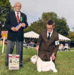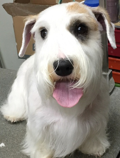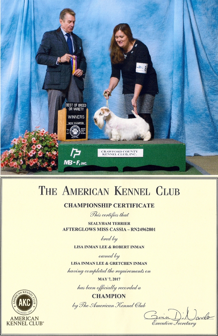 Cassia has an impressive pedigree as she is the great-granddaughter of "Charmin" AKC name CH Efbe's Hidalgo At Goodspice) on her mother's side. She is also the granddaughter of "Ben Low" (AKC name CH Stonebroke Right On The Money). Both Charmin and Ben Low are the top two Sealyhams of all time and faced off against each other at the major shows around the world.
