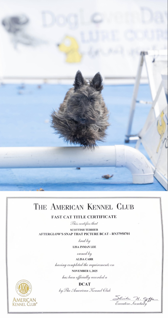Chumley (a.k.a. Chummy or Chum Chum Head), truly an old soul. Chumley possesses a rare universal charm; he loves every dog he meets, and they all adore him in return. His favorite pastime? Cruising in the golf cart to Dunkin' for a drive-through pup cup, always shared with his brother, Tavish. Chumley is also a talented athlete, holding his DCAT title in FastCAT. Beyond the track, he's the picture of serenity at home, a genuinely chill companion who's an absolute pleasure for his family.