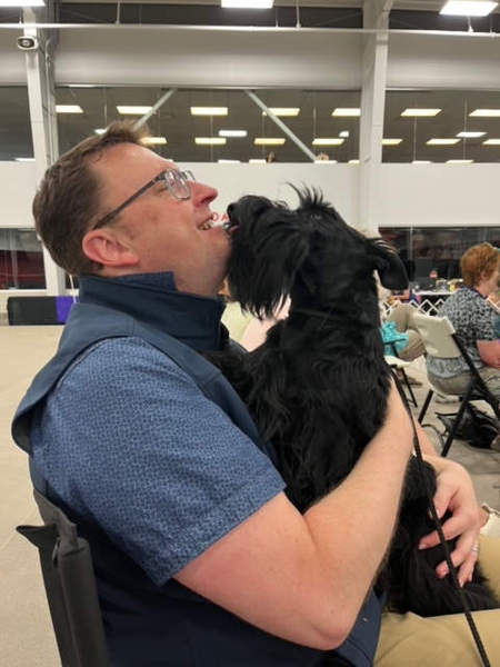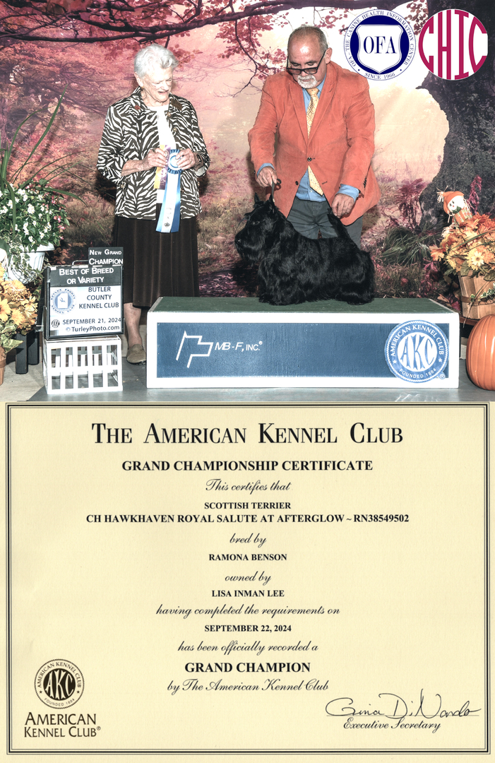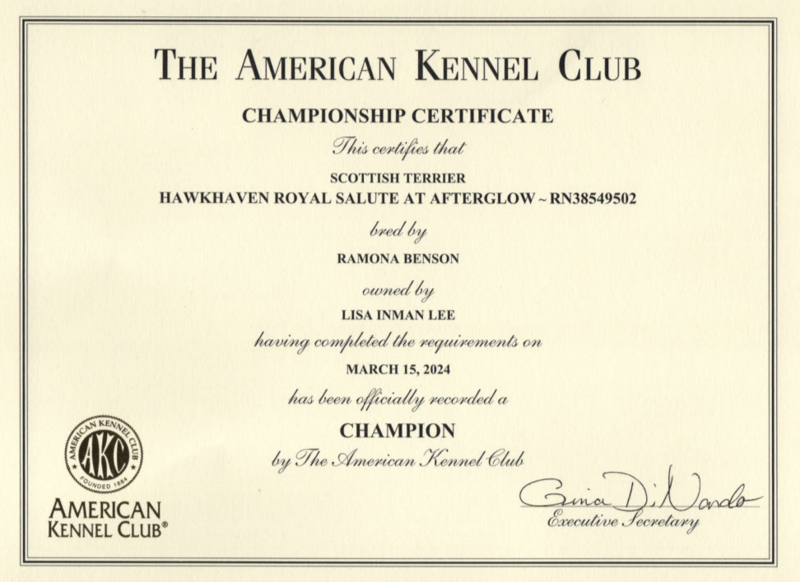 He returned to the show ring in early 2024 after taking a break to move from puppy-hood to adulthood. He very quickly completed his AKC Championship in March 2024. He has already sired some wonderful puppies (see below).