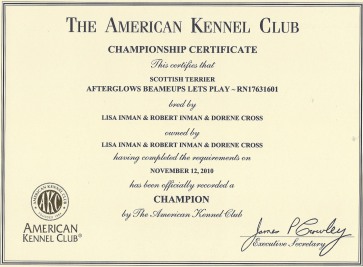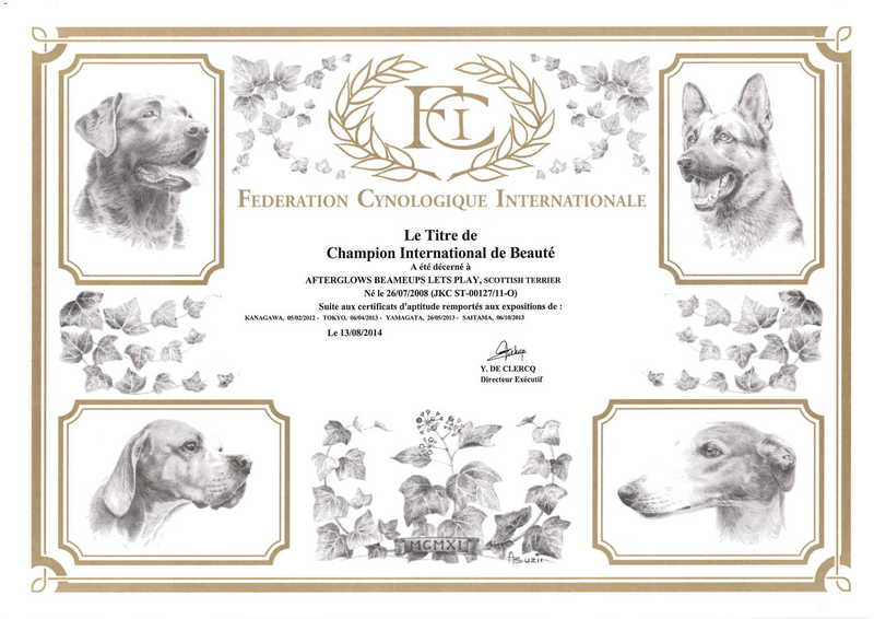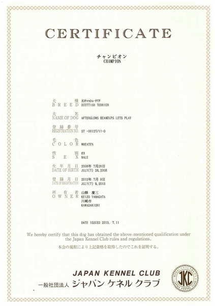 After completing his AKC Championship and earning many points towards his AKC Grand Championship, he flew to Japan and earned his Japanese Championship.