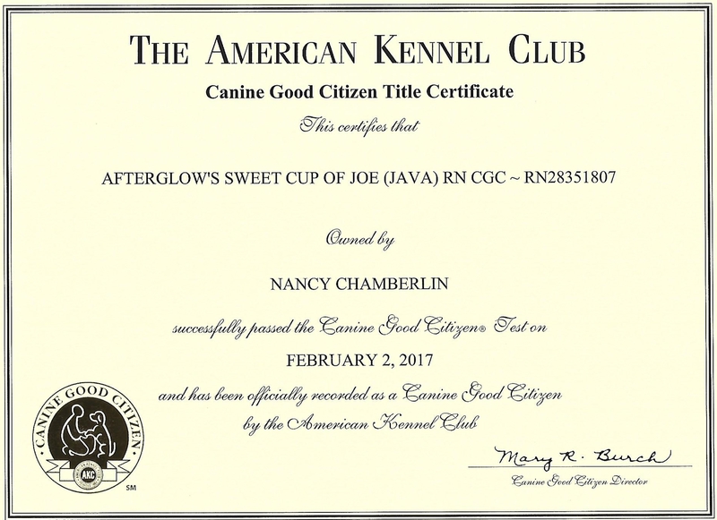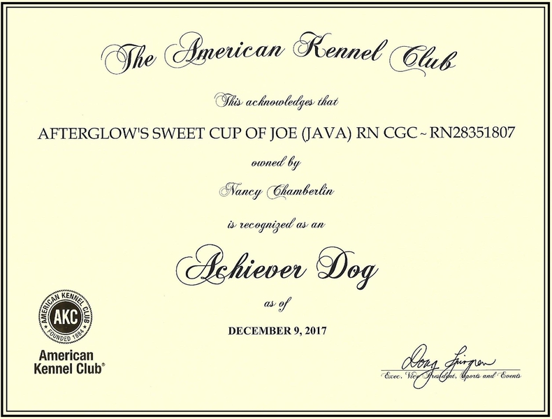 He started by competing in the Rally category, earning his Rally Novice (RN). Then he earned his Canine Good Citizen (CGC). He entered the dog show ring to earn his AKC Championship (CH) for conformation in 2018. He has returrned to Rally and now has his Rally Intermediate (RI). With his CGC already in place, just has to perfom five more tricks to earn his Novice Trick Dog (TKN), it won't be long. What do you want to earn next Java?