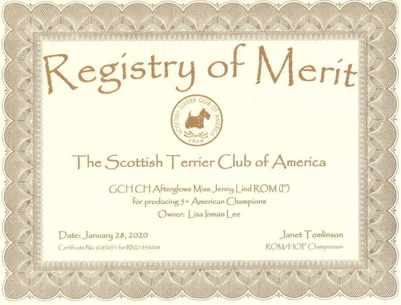 She also earned the STCA Registry of Merit (ROM) for producing six champions of her own.