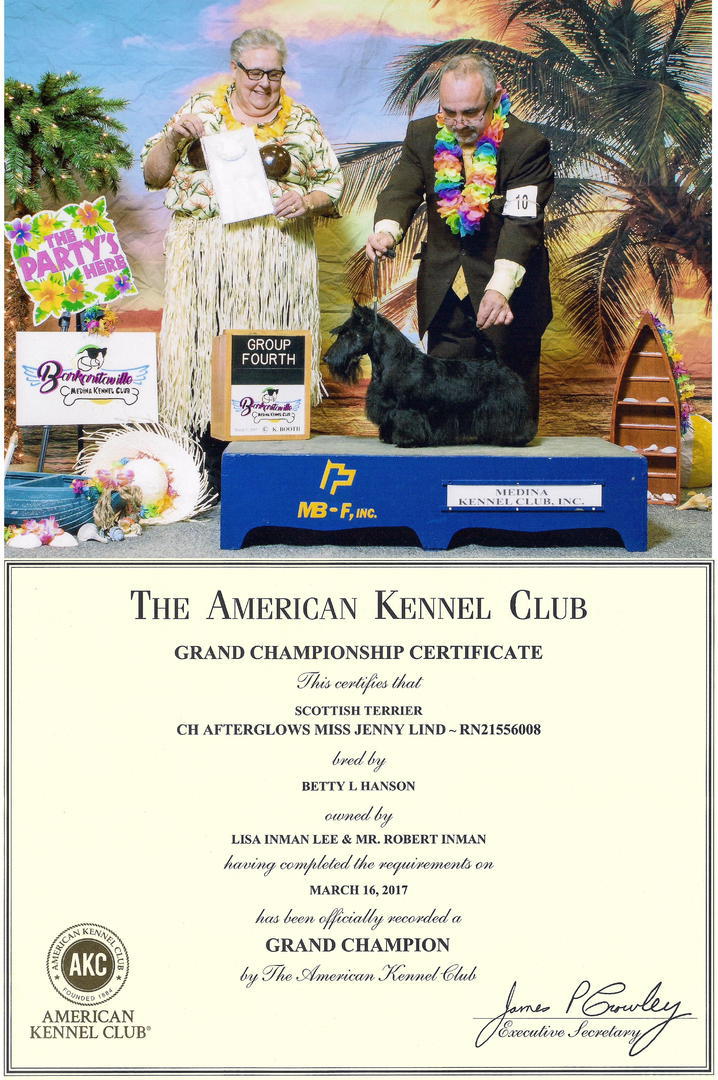 Lisa's daughter, Gretchen, handled Jenny to her ACK Championship and nearly finished her Grand Championship before they moved to Ohio. Three years later, Jenny came out of retirement to finish her Grand Championship and did it in style with a Group 4 placement handled by Santiago Pinto.