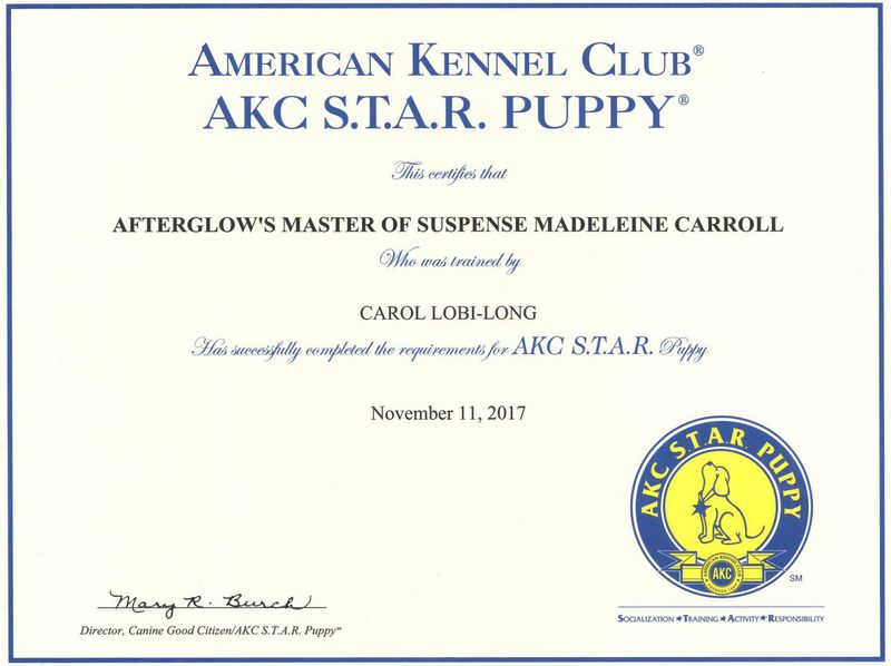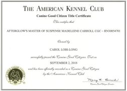 "It is still important that I obey by knowing about 'Stay', 'Down', 'Leave it', and 'Go to'; these I all learned in all those courses getting to earning my AKC Canine Good Citizen. I travel with my parents and my CGC allows me to be in hotels and restaurants, but I must behave at all times."