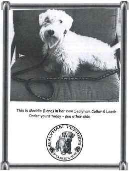 "My parents are members of the American Sealyham Terrier Club and I am the spokesperson and model for the leash and collar sales. We designed our own with a leaping, playful Sealy like me. Here is my photo that appears in the ASTC's newsletter, 'The BARKS'. (Please, join the CLUB!)