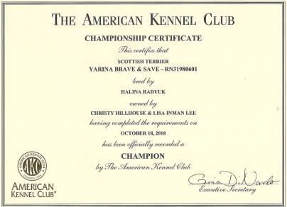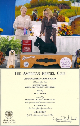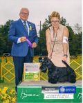 Nova came here from Belarus and is quite sweet and outgoing. These qualities have served her well in the show ring, which she loves, having earned her AKC Championship at 14 months of age. She is shown with handler Rebecca Cross and at their first show together, Nova earned eight points and two major wins toward her eventual championship.