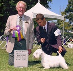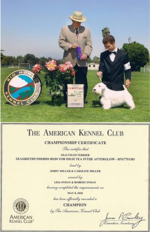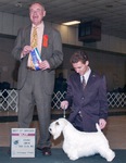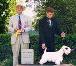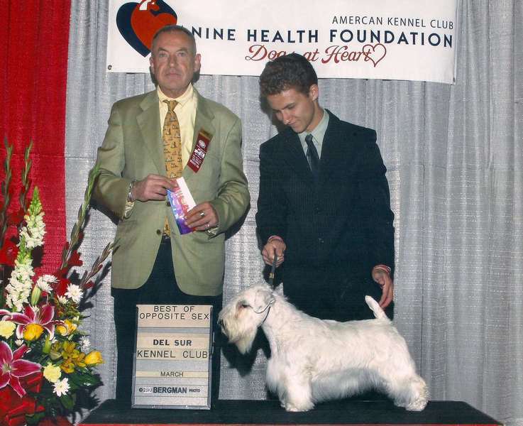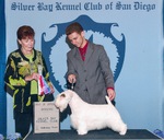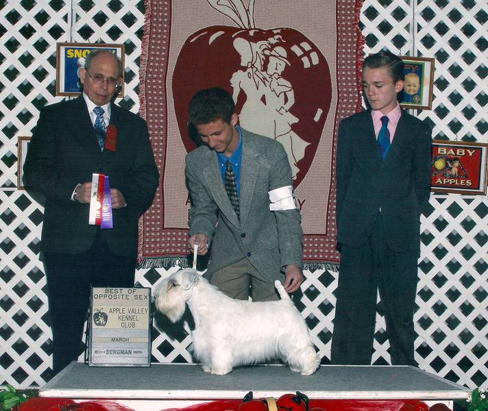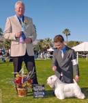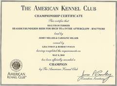 She loves her family and demands that anyone petting her not stop. She is a couch potato and loves to be held and have her belly rubbed. She started her show career at a young age as evidenced by all of the puppy awards she earned. Her progeny have been successful as well qualifying her for a Registry of Merit for the number of AKC Champions she has produced.