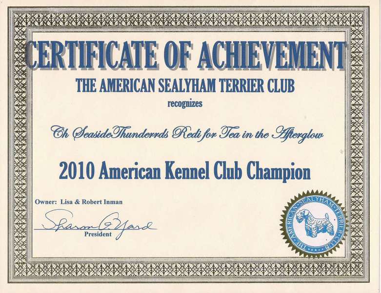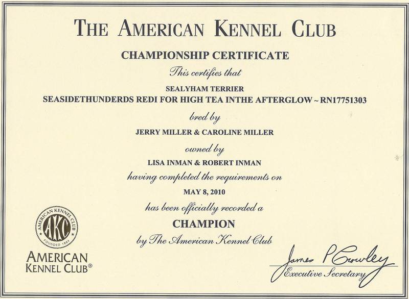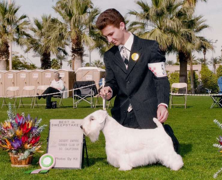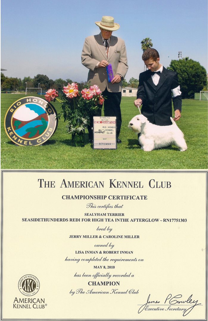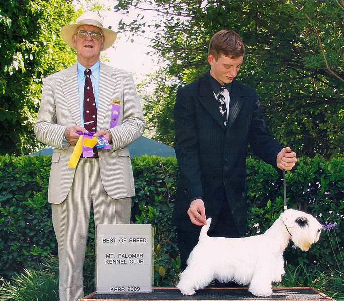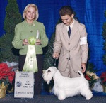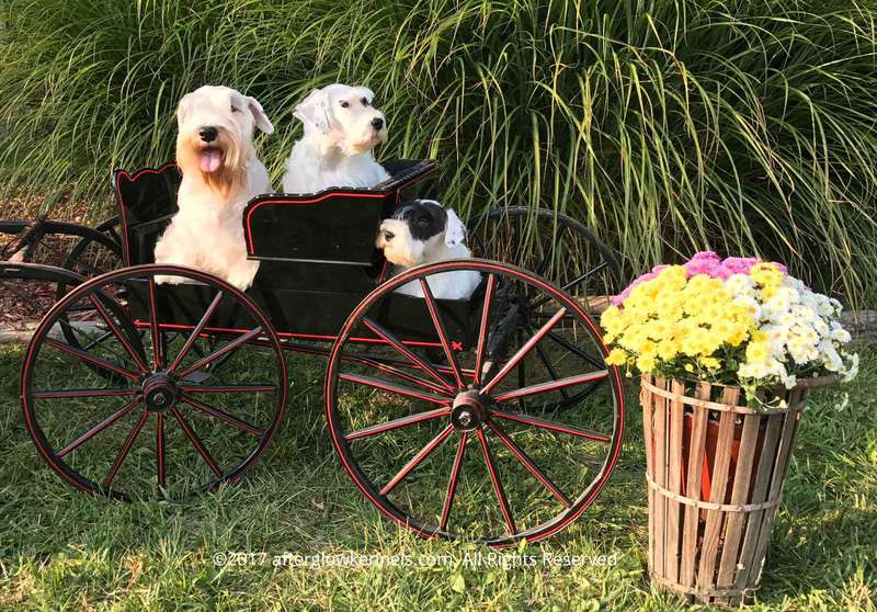 Pollyanna is the matriarch of the Afterglow Sealyhams. After years of raising Scotties, Lisa met her first Sealyham and knew she wanted a Sealy herself. After much effort, she was finally able to get Pollyanna. Her sire is CH Efbe's Hidalgo At Goodspice, call name Charmin, the top-winning Sealyham of all time and has won more top awards than any dog in the world.