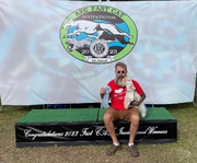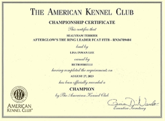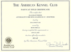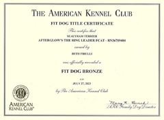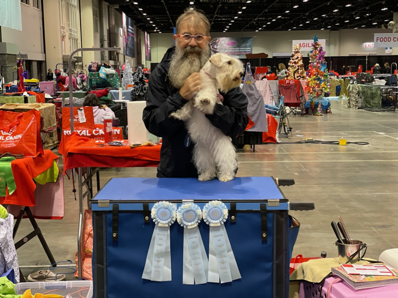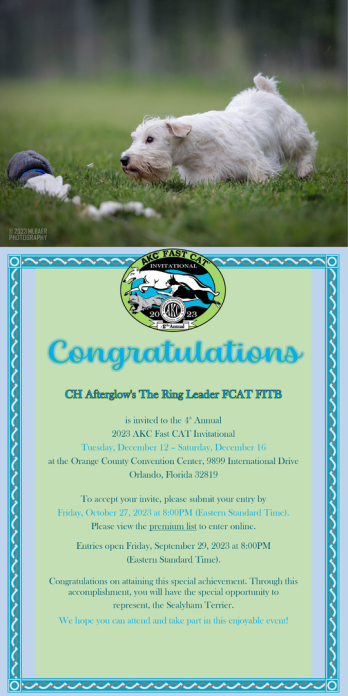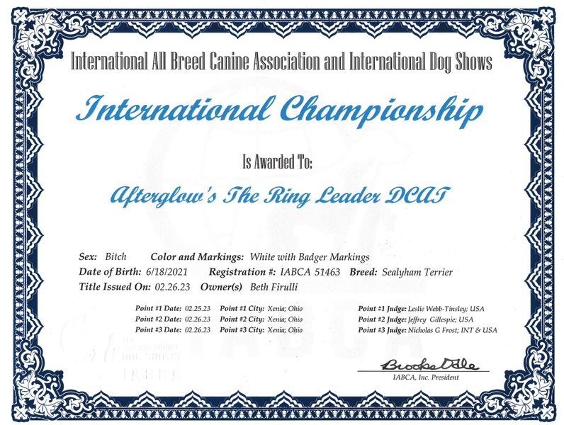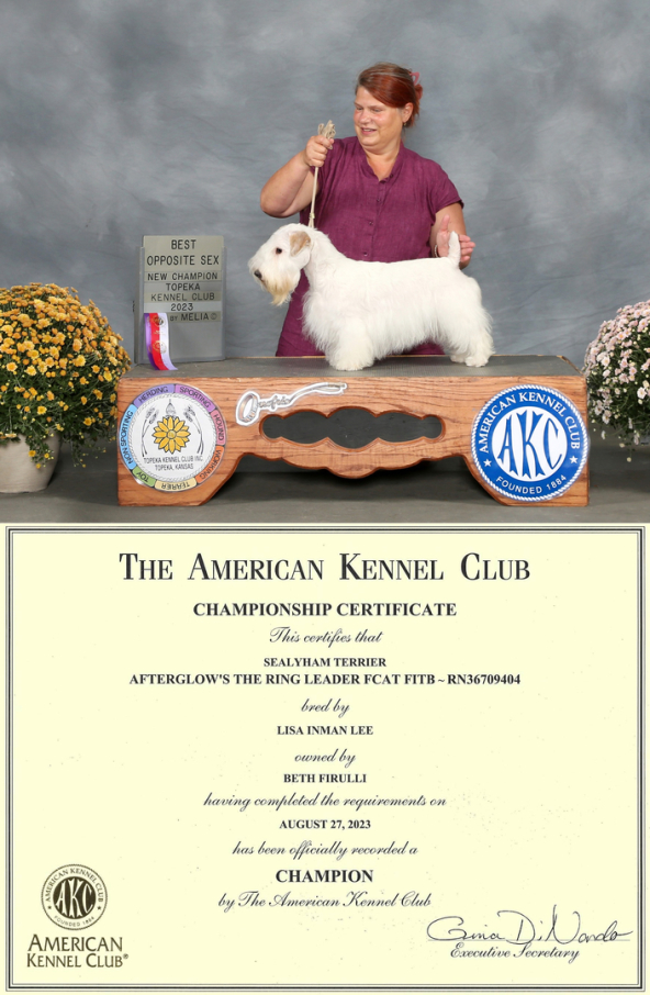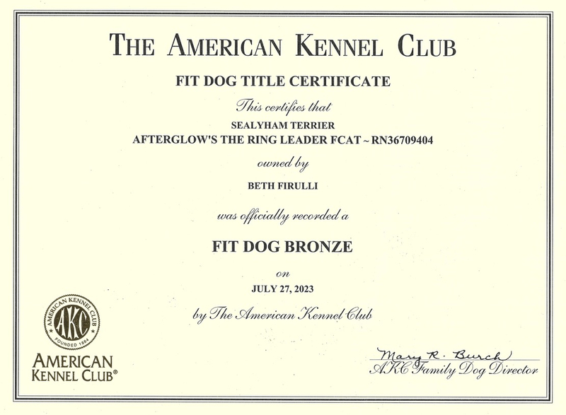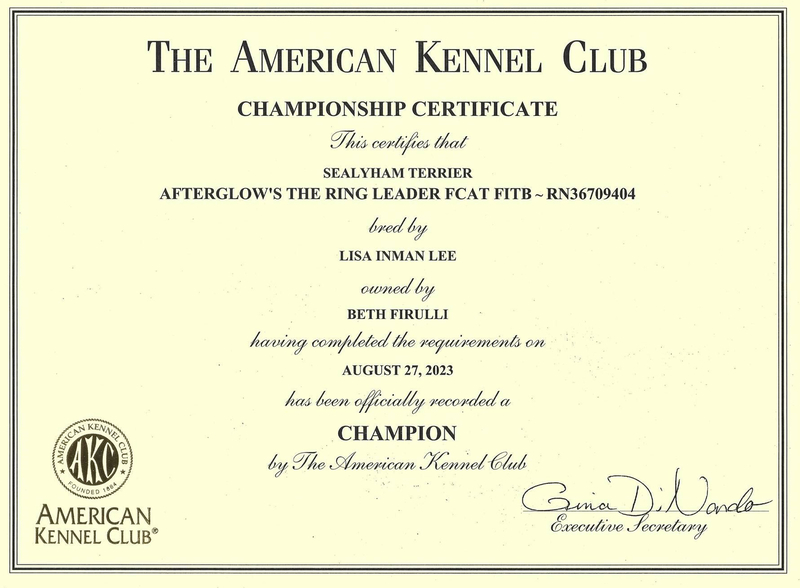 Mary Poppins (CH Afterglow’s the Ringleader FCAT FITB2) is practically perfect in every way – just like her namesake. Poppins currently calls Indianapolis home where she lives with her mom, Beth, and dad, Tony. From the day we brought her home, she has been a very sassy head up / tail up girl following Beth, her mom, everywhere she goes, but is also happy to snuggle the evening away. While she shows nicely in the confirmation ring for her Beth, her real love is chasing the FastCAT lure. In 2022, she was ranked as the #2 Sealyham Terrier with her 3-run average at 17.80MPH which earned her an invitation to the Fast CAT Invitational in Orlando, FL.