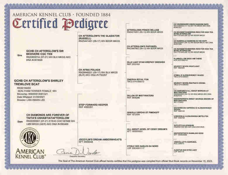 Our Shirley finished 2023 as the #4 Sealyham in the USA and has been invited to the Westminster Kennel Club Dog Show in NYC!