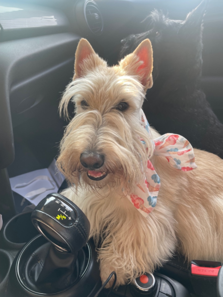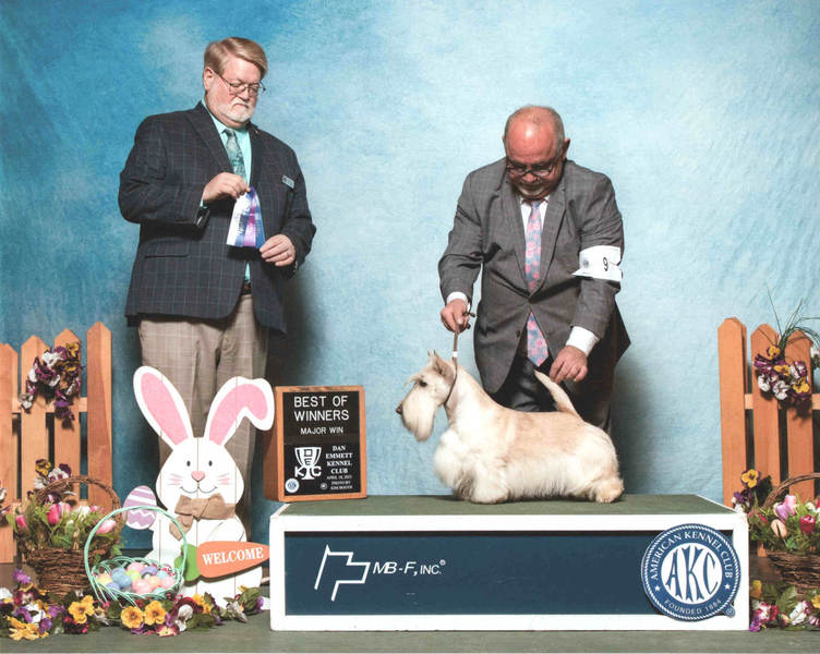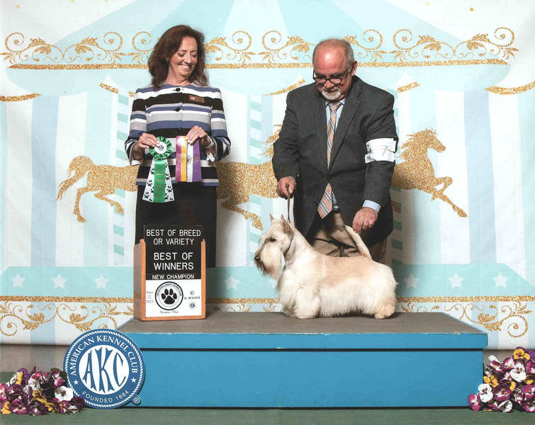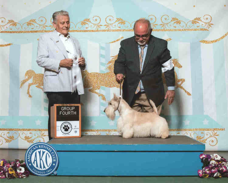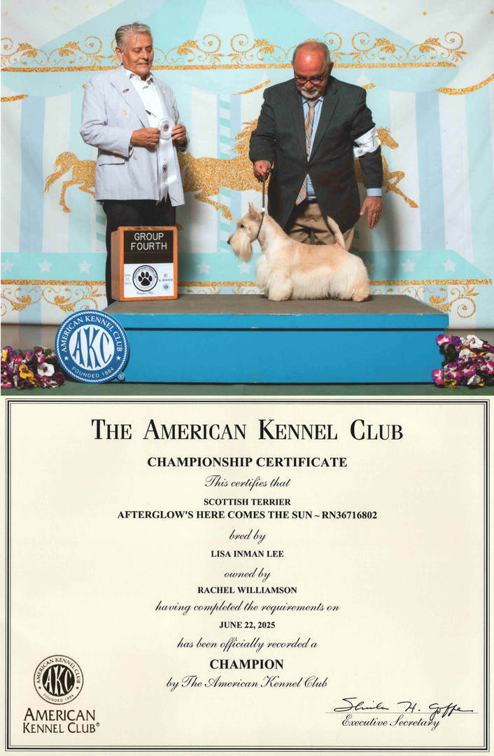 Tavish was originally brought home as a companion but his owners decided to have him try his paws in the ring. The result is an AKC Champion (like his littermate sister, Sandy) with a heart as golden as his coat. Known for his sweet temperament and irresistible cuddles, he brings warmth and charm wherever he goes.