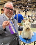 In the ring, Tavish shines under the expert presentation of his handler, Santiago, who showcases his confident stride and classic Scottie stance with grace.